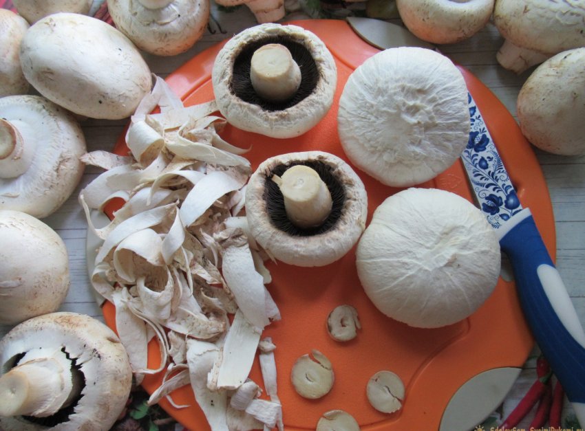 Сразу отметим, что мыть шампиньоны, предназначенные для сушки, не рекомендуется. Любые грибы, смоченные водой, будут сохнуть гораздо дольше. Кроме того, они утратят свой неповторимый аромат. Чтобы избавиться от остатков грязи, со шляпок снимаем верхний слой кожицы, а у ножек освежаем срез (то есть отрезаем 2-3 мм.). Кстати, поддевать кожицу удобнее с внутренней стороны шляпки шампиньона при помощи кофейной ложечки. В итоге у нас образовалось около двухсот граммов отходов. Ну, да не велики потери.