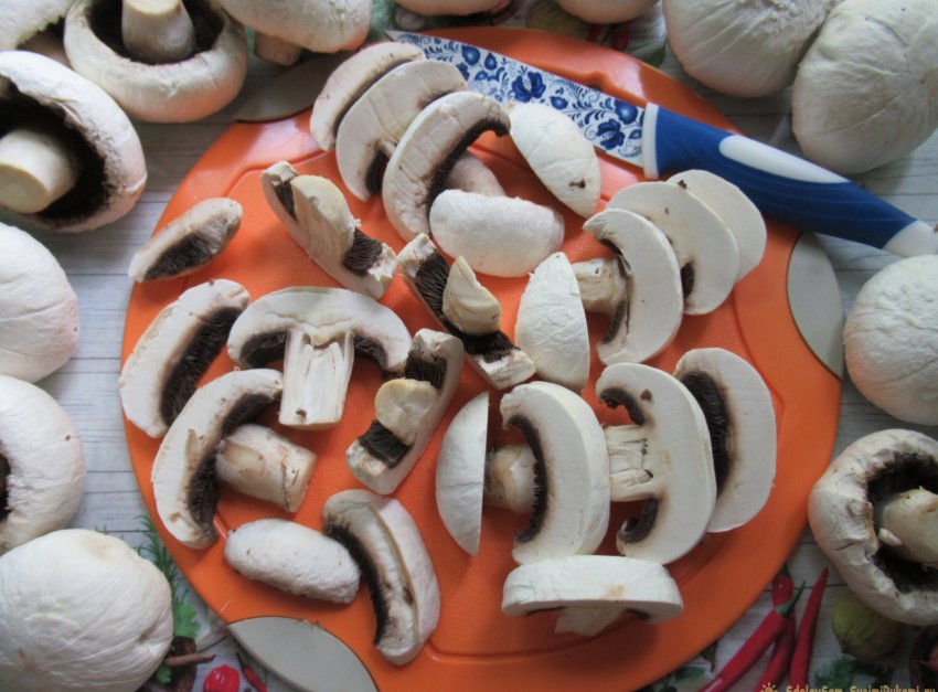 Теперь, вооружившись хорошо наточенным ножом, нарезаем шампиньоны (а их у нас 800 г.) слайсами не более 8 мм. толщиной.