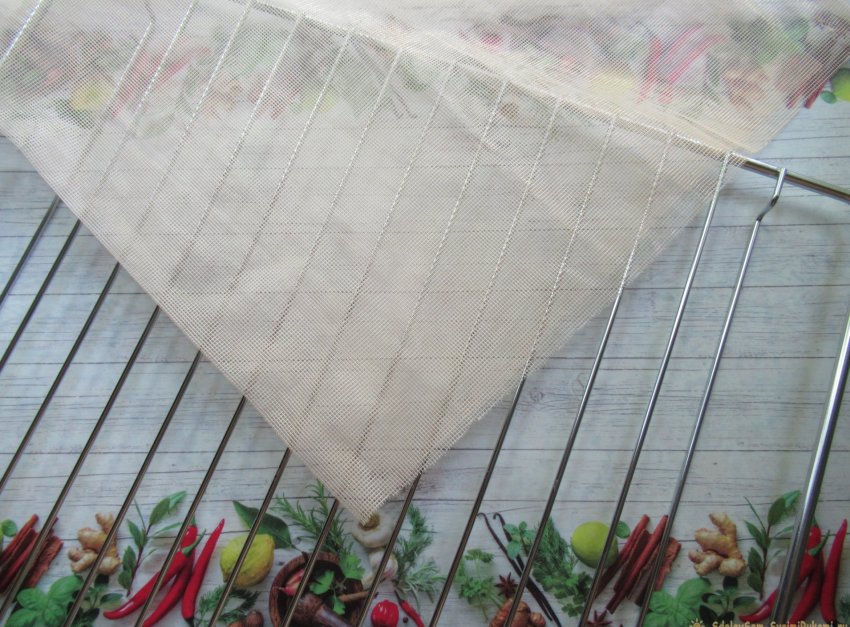 Для сушки грибов мы используем решетку от духовки (их нам понадобилось 2 штуки), которую застилаем мягкой москитной сеткой (или марлей). Подойдет и пергамент.