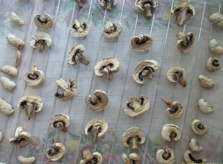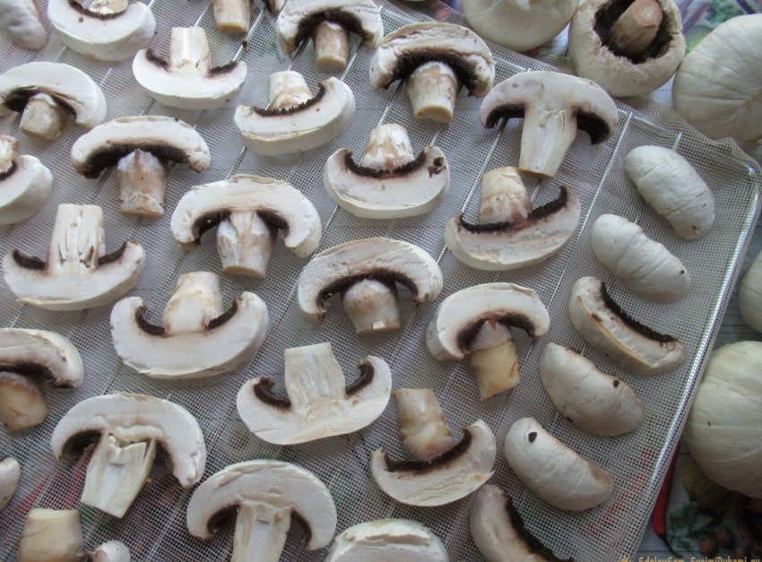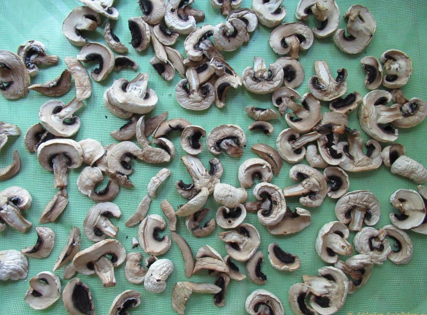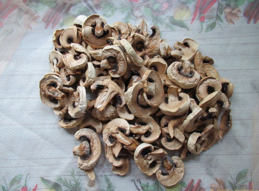Сушим грибы вдали от солнечных лучей в хорошо проветриваемом помещении. Это может быть любая комната в квартире (доме). Расположить решетку с нарезанными шампиньонами можно где-нибудь на шкафу или на холодильнике, на полке над кухонной плитой или на лоджии (балконе). При наличии в помещении насекомых желательно прикрыть грибы марлей. Кстати, это убережет их и от пыли. Спустя двое суток пластинки шампиньонов скукожились, значительно уменьшившись в размере. Встряхиваем и соединяем слегка подсохшие грибы с двух решеток на одном подносе, застеленном все той же сеткой, и оставляем сохнуть еще на 3-5 дней. Каждые сутки ворошим их, чтобы они просушивались со всех сторон.