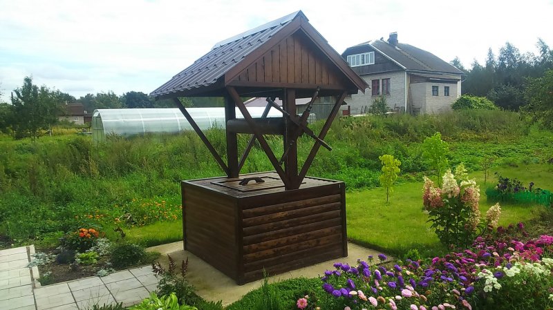 После изготовления домика для колодца начинается его каждодневное эксплуатирование. Чтобы продлить жизнь своему творению, необходимо произвести тщательную обработку антисептическими составами и пропитками для защиты древесины от проникновения влаги в ее структуру и, следовательно, от гниения. На поверхность домика можно нанести лак или покрасить ее. Благодаря этому мы защитим участки, которые вынуждены противостоять воздействию дождей и снега. Такое оформление позволит придать домику эстетичный вид. С помощью ярких цветов и лака всегда получается создать уютную атмосферу на участке.