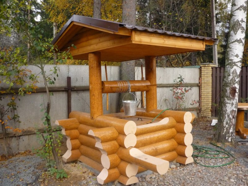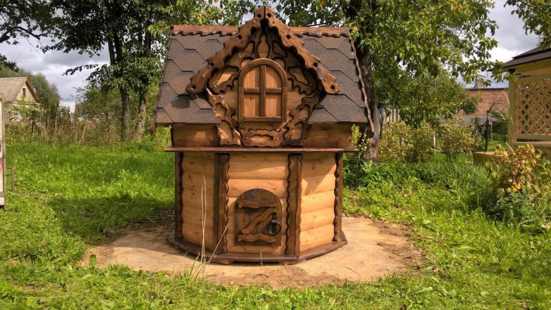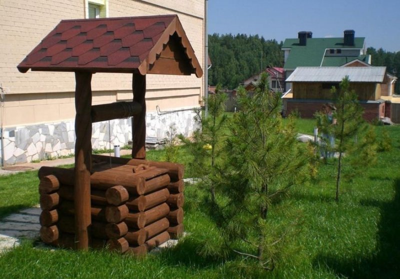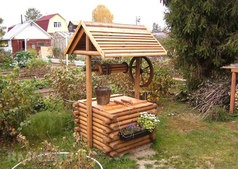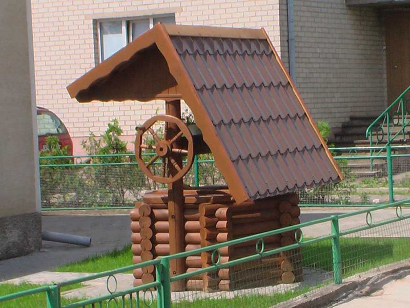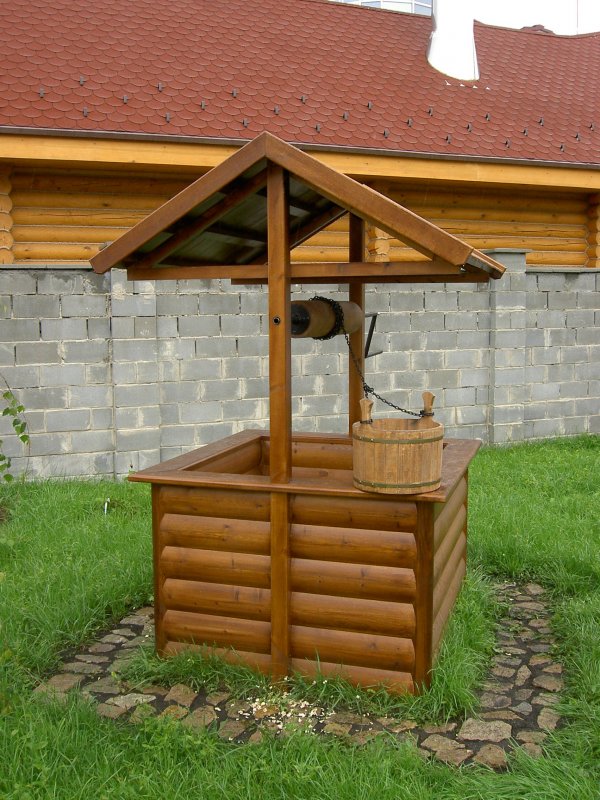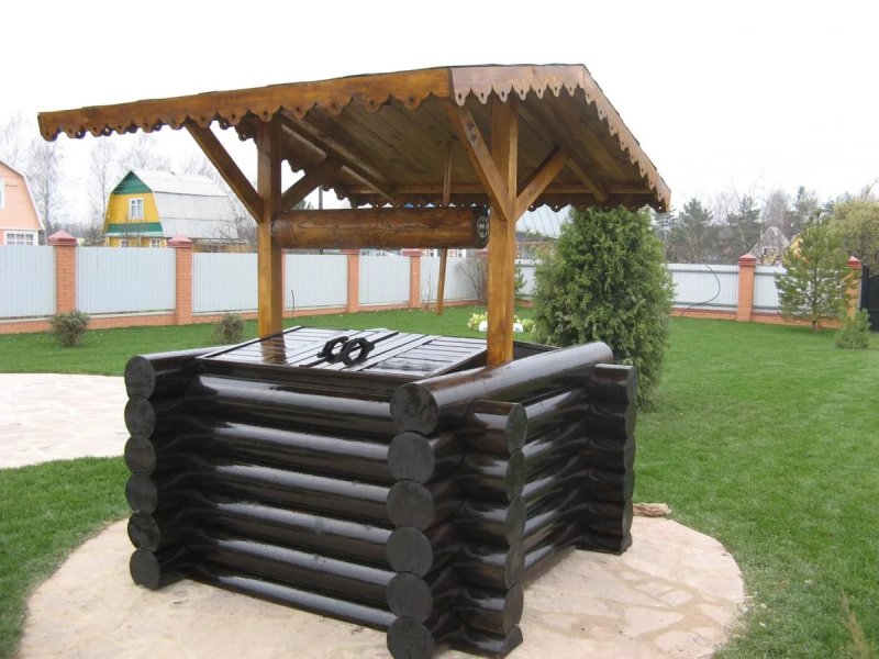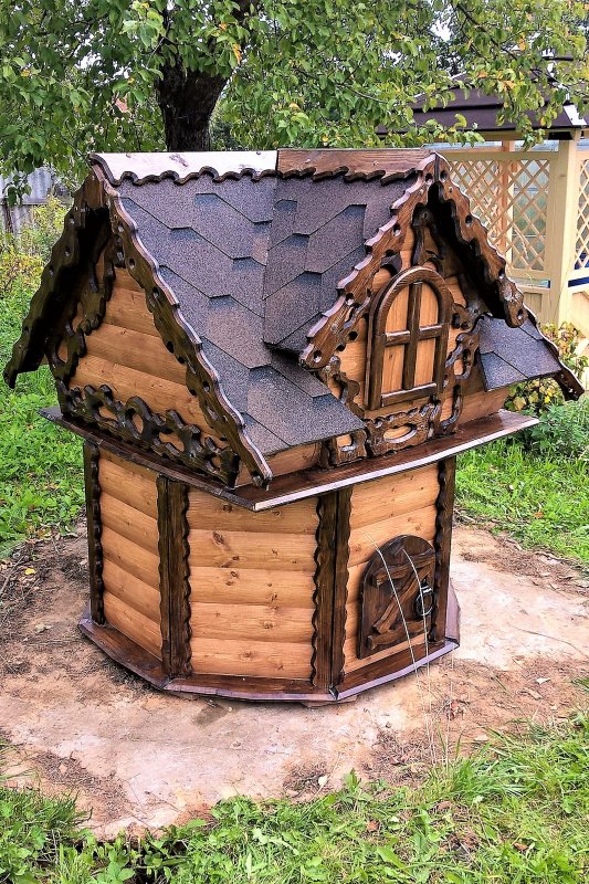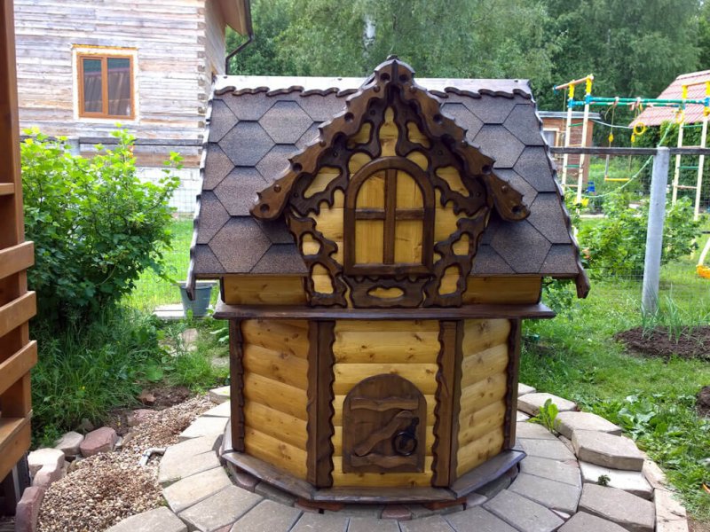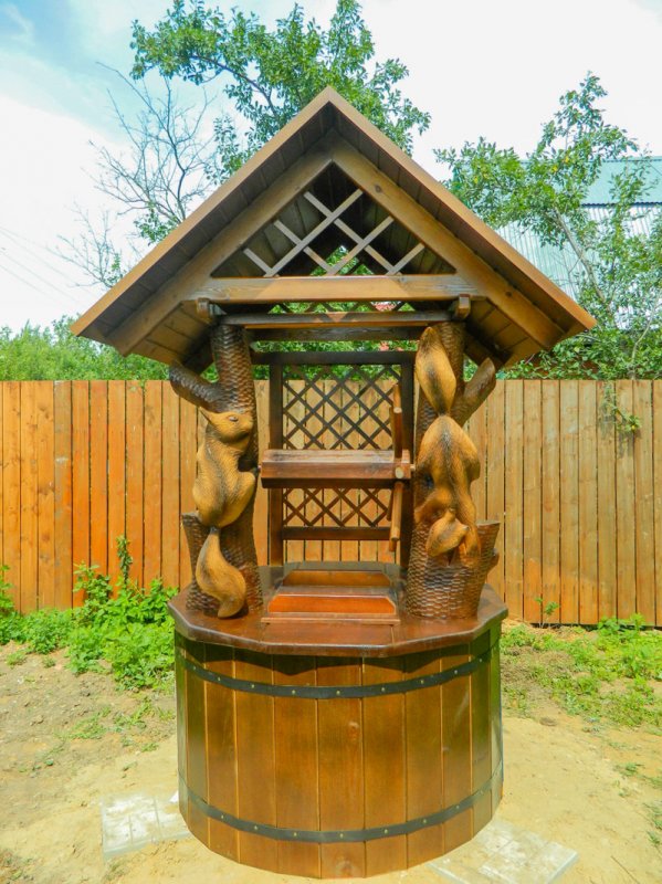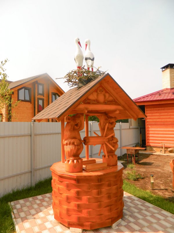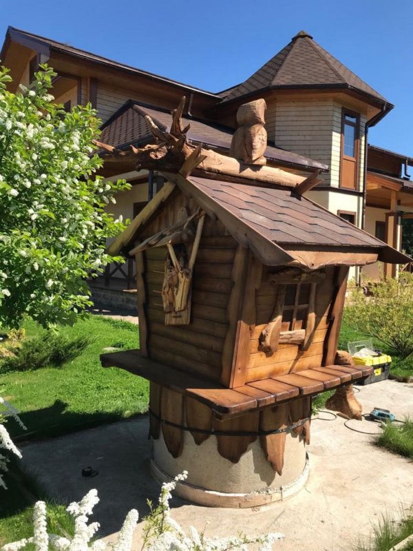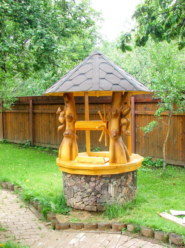 Если домик выполнен из дерева, для украшения можно использовать резные детали. При помощи пропиток и лаков разных оттенков дерево можно сделать солнечно-желтым или затемнить. Часто возле колодцев устанавливают различные деревянные скульптуры.
