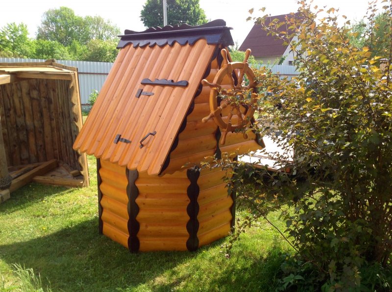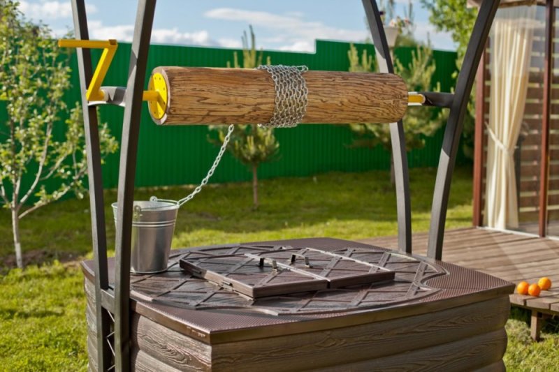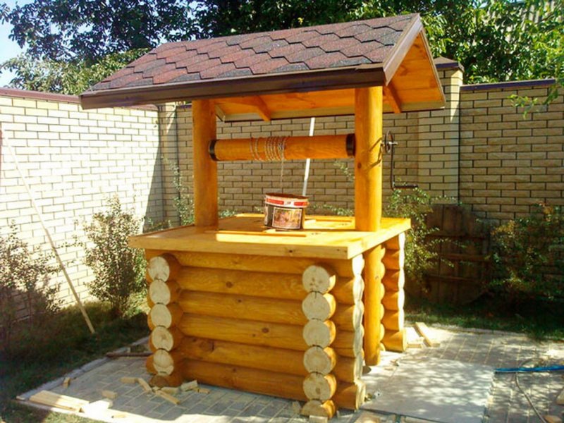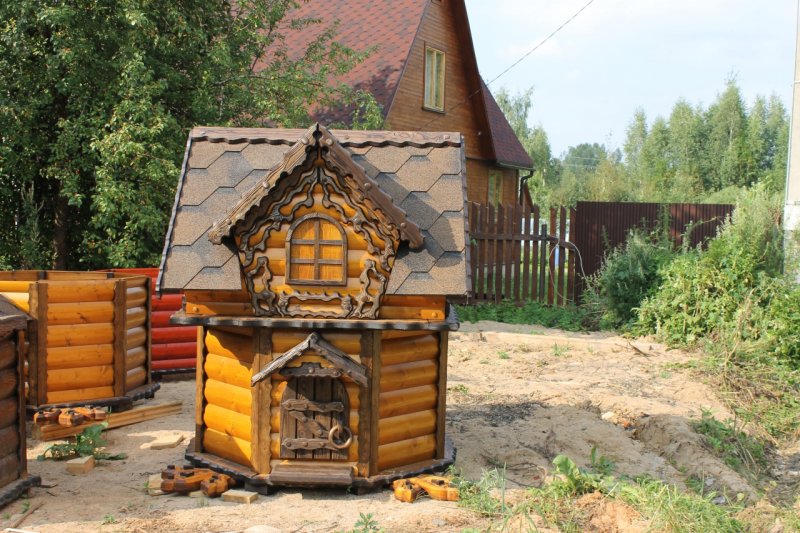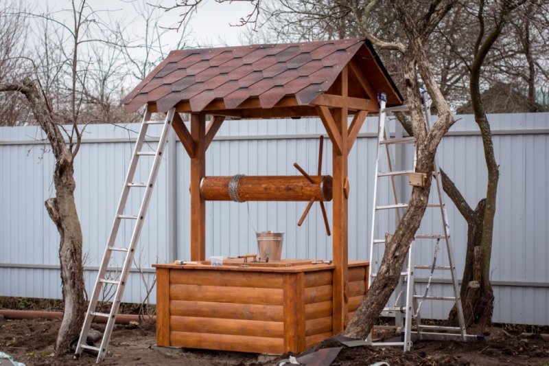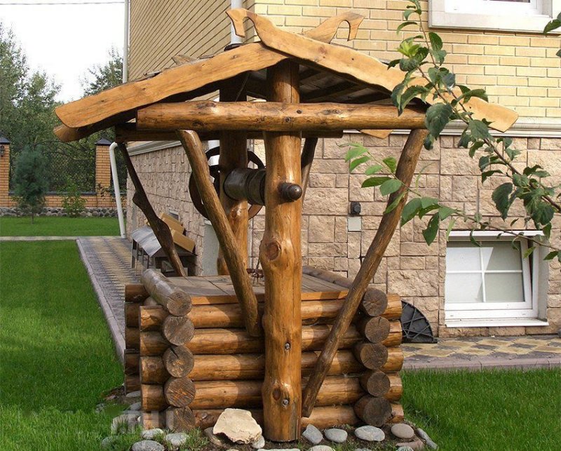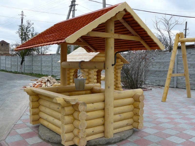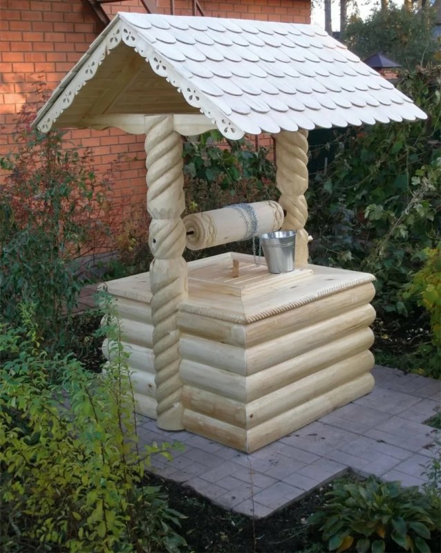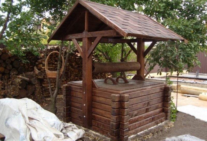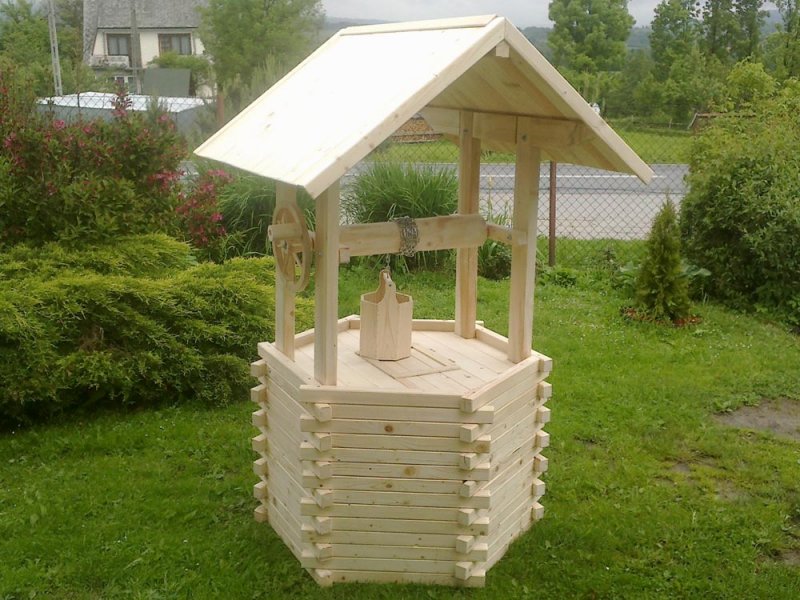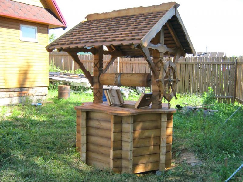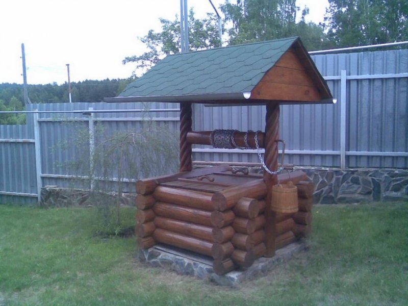 Если домик выполнен из дерева, для украшения можно использовать резные детали. При помощи пропиток и лаков разных оттенков дерево можно сделать солнечно-желтым или затемнить. Часто возле колодцев устанавливают различные деревянные скульптуры.