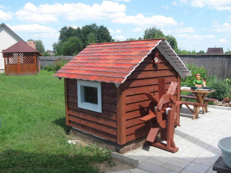 Важно тщательно продумать этот момент. Необходимо выбрать материал, который не позволит конструкции развалиться под собственным весом или под напором внешних воздействий. Обшивка домика – заключительный этап. Для облицовки можно выбрать материал, которым отделан дом или любой другой, который не только впишется в окружающую обстановку, но и понравится владельцам участка.