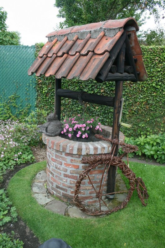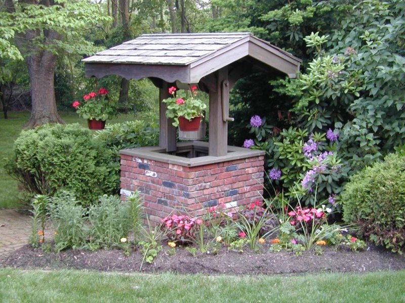 Колодец, основание которого оформлено природным камнем, выглядит сказочно. Кажется, будто он появился из волшебного королевства, где обитают фантастические существа, эльфы и гномы. Сочетая камни разных оттенков, можно выложить живописные узоры, орнаменты и от вашего колодца будет глаз не оторвать. Дорожки, выложенные брусчаткой, морской галькой, газоны с сочной травой сделают всю композицию чрезвычайно привлекательной.