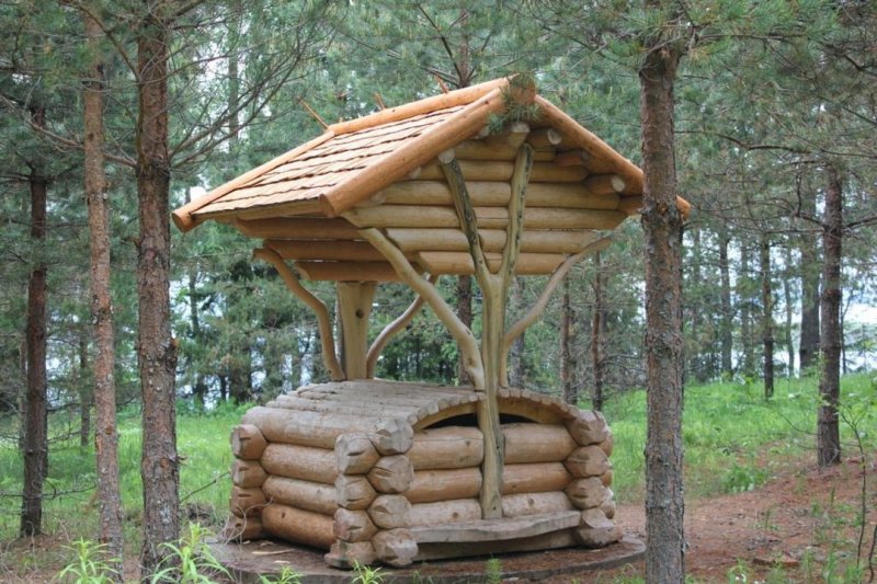Бревенчатый сруб выглядит весьма аутентично, напоминает старинную избушку. Бревна используются в этой конструкции также в качестве опор и ворота.