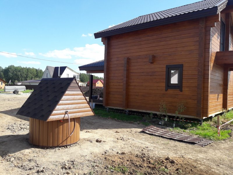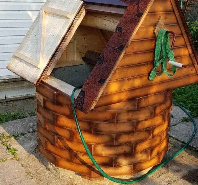 Колодцы, отделанные вагонкой, отлично смотрятся. Монтаж ламелей осуществляется на каркас с помощью саморезов. Между собой доски соединяются с помощью замковой системы шип-паз.