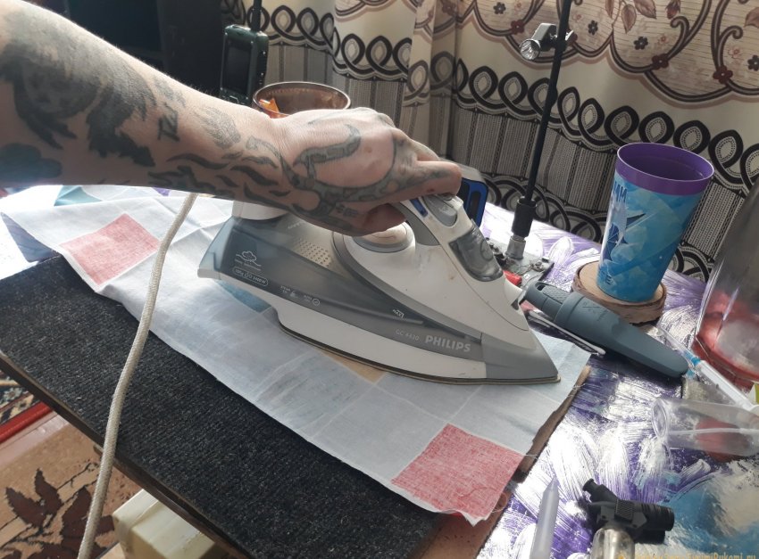 Укладываем ковролин на место, накрываем его тканью, дабы не проплавить ворс, и тщательно проглаживаем горячим утюгом.