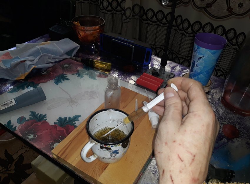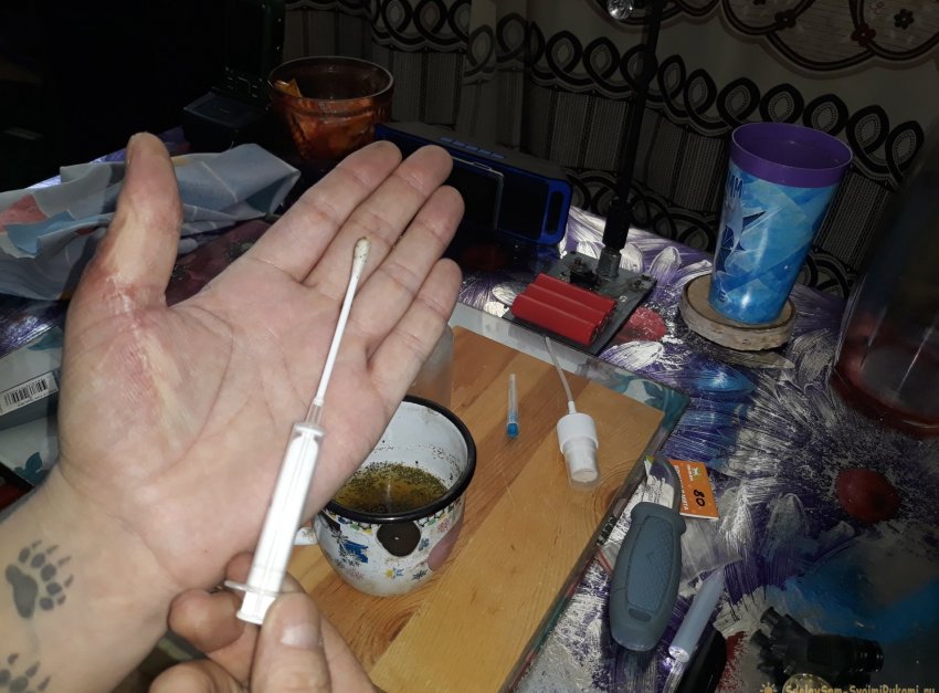 Даём настояться, пока не остынет. Теперь берём ватную палочку, отрезаем один конец, и втыкаем трубку в шприц. Вместо иглы.