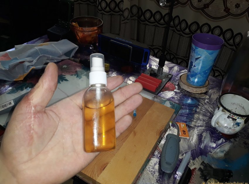 Набираем в шприц, через этот импровизированный фильтр, остывшую заварку и переливаем её в распылитель.