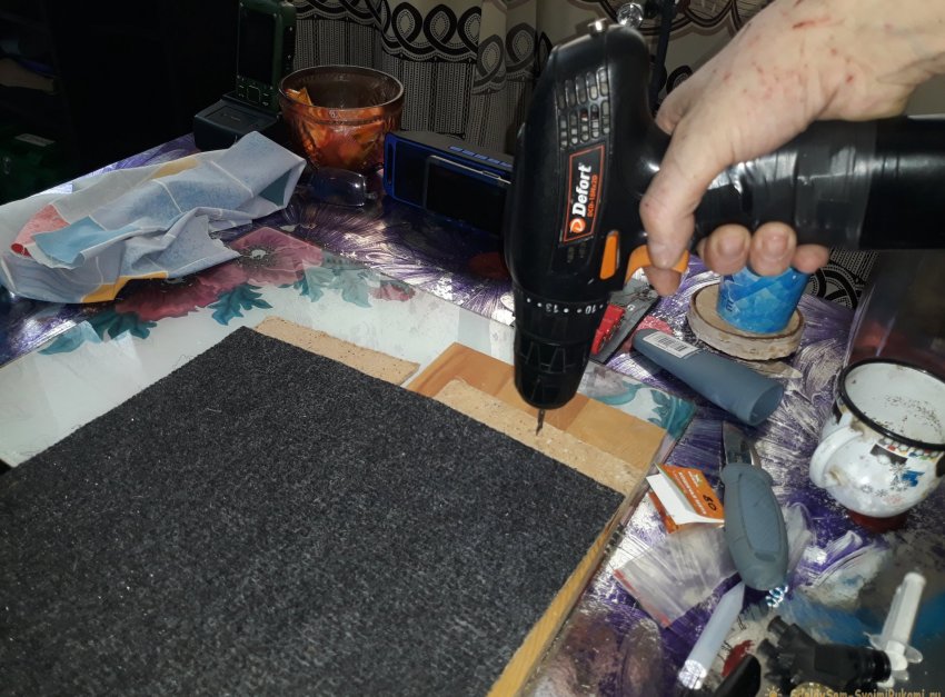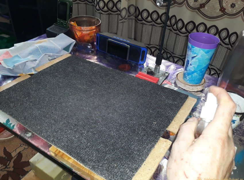 После этого, пока клей мягкий, нужно прижать ковролин к фанере, и подождать пока он схватится. Вот что в итоге должно получиться: