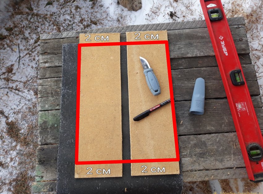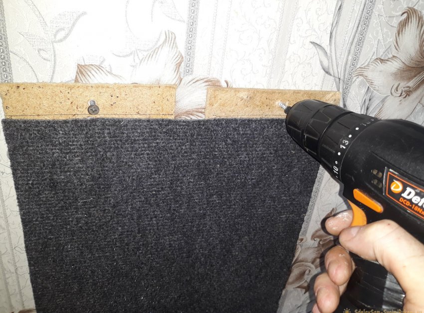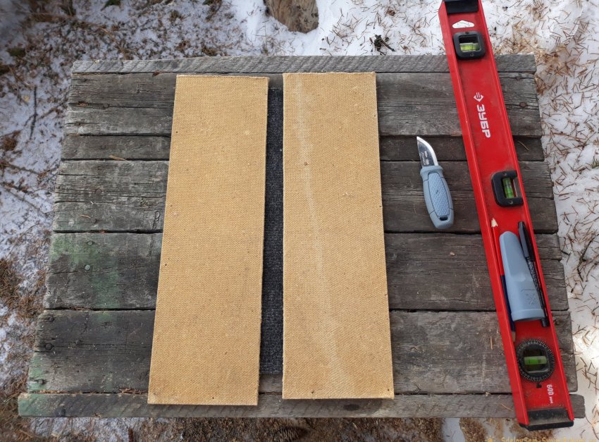 Теперь нужно вырезать подходящий кусок ковролина. Для этого выкладываем заготовленные части фанеры на одном уровне, с расстоянием 2 см друг от друга. Вырезаем ковролин по получившейся ширине двух заготовок с оставленным расстоянием. А вот длина ковролина должна быть на 4 см короче длины фанерных заготовок. Это нужно, чтобы оставить отступы с каждого конца по 2 см, для крепления саморезами к стене. Вот так: