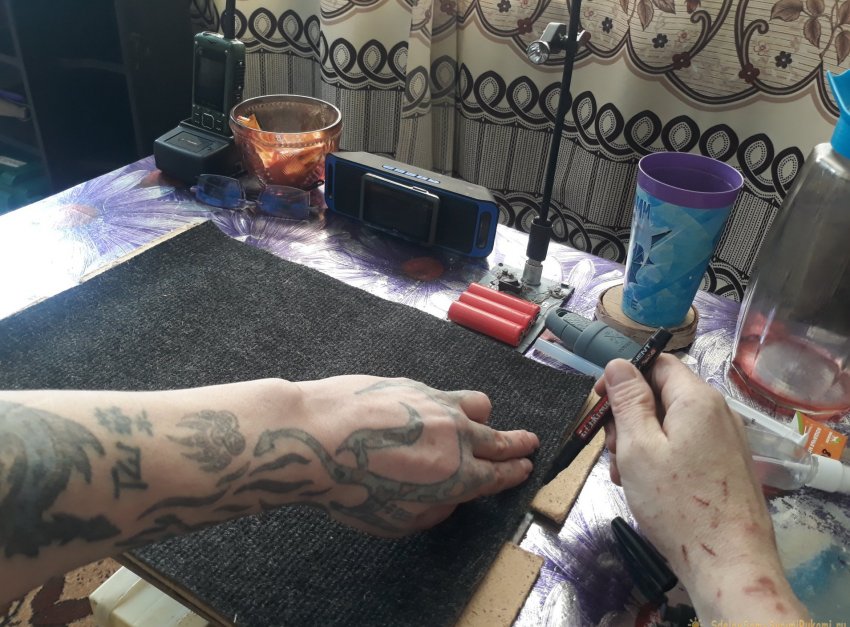 Далее, отмечаем маркером на фанере края ковролина, и наносим на места, где будет лежать ковролин, горячий клей.