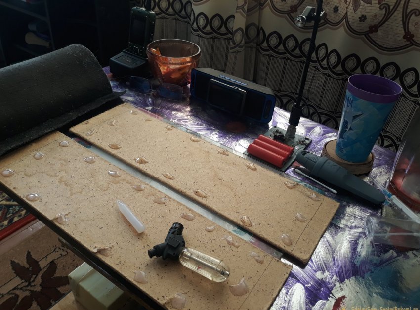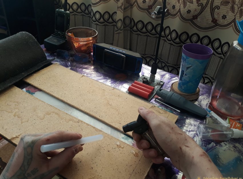 Не стоит беспокоиться, что клей успеет застынуть. Так как я не желал ждать, пока нагреется пистолет, то просто плавил клей зажигалкой, и наносил его на заготовки.