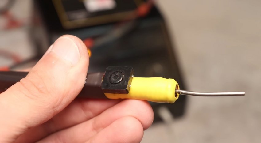 На рукоятке кнопка. Просто подаёт напряжение от источника. Когда кнопка отжата, ШИМ-регулятор с компрессором обесточены. Провод от пинцета к блоку питания лучше применить гибкий, типа МГТФ. Впрочем, у нас такого не нашлось и взяли обычный в виниле.