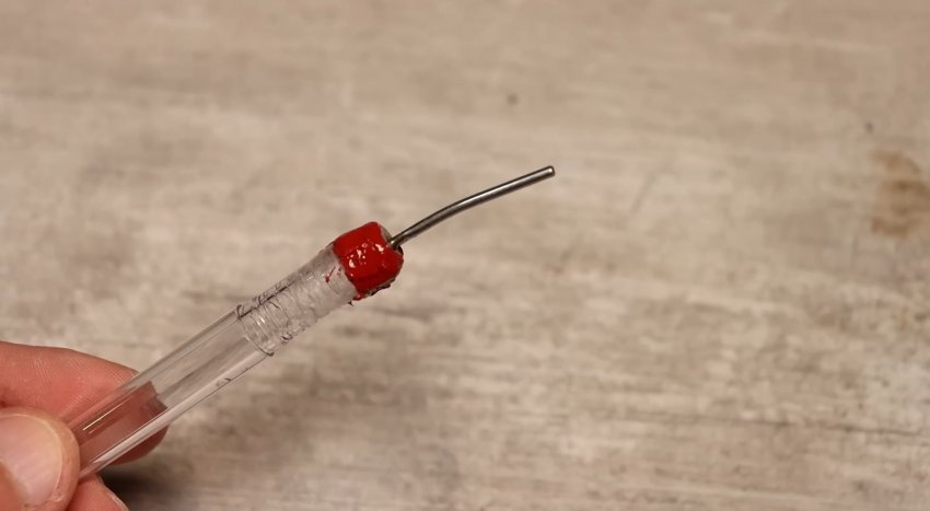 Под установку иглы отверстие пришлось немного расширить при помощи сверла. Сама игла установлена также с дополнительной фиксацией герметиком. Внутрь корпуса ручки поместили кусок поролона в качестве фильтра от попадания пыли, припоя, кусочков мусора.