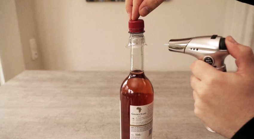 Убеждаемся в том, что крышка ПЭТ-бутылки в точности подходит к горлышку винной бутылки из стекла. Теперь пламенем газовой горелки осторожно и равномерно нагреваем часть горлышка ПЭТ-бутылки по кругу.