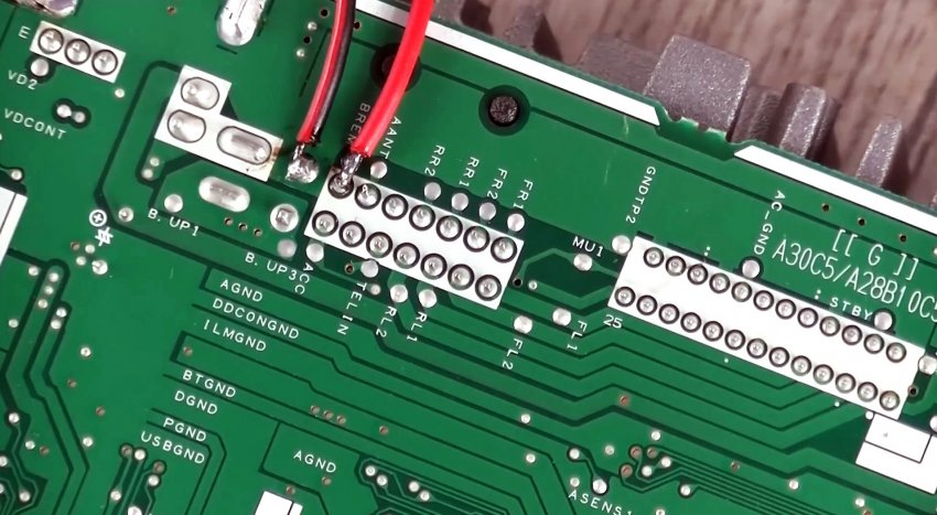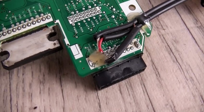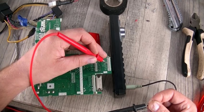 Впрочем, если бы не было подписано, то найти нужные точки для подключения можно очень просто: берем штекер аудиоразъёма, вставляем в «AUX», подключаем панель и при помощи прозвонки начинаем вычислять, где какой контакт. Таким образом находим все необходимые для подключения пины. Соединяем схему устройства.