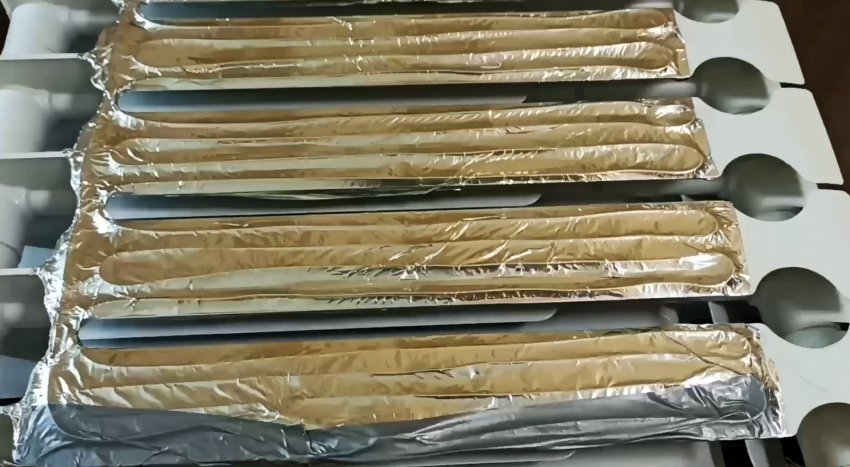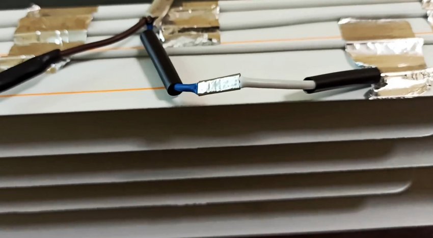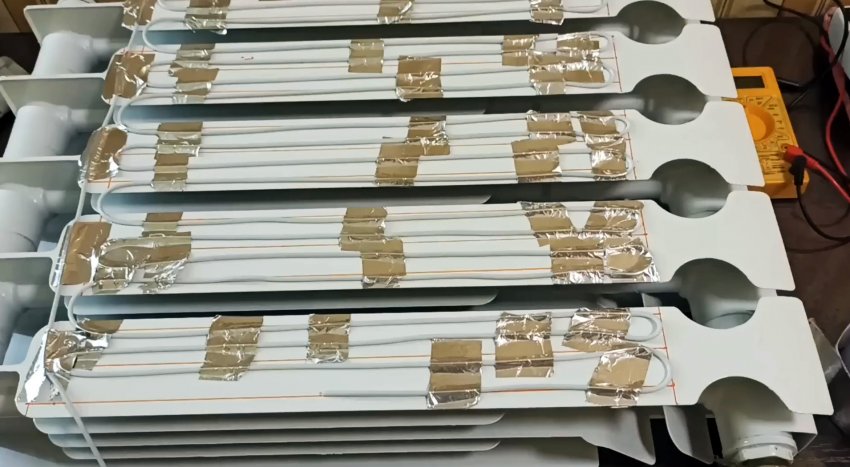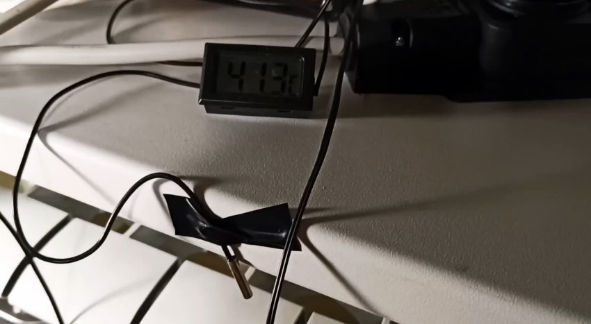 Модернизированная батарея была установлена на место. Для дальнейших тестов будут использоваться контроллеры для тёплого пола. Для измерения температуры используются электронные термометры с выносными датчиками. Один расположен в воздухе над батареей, второй закреплен внизу.