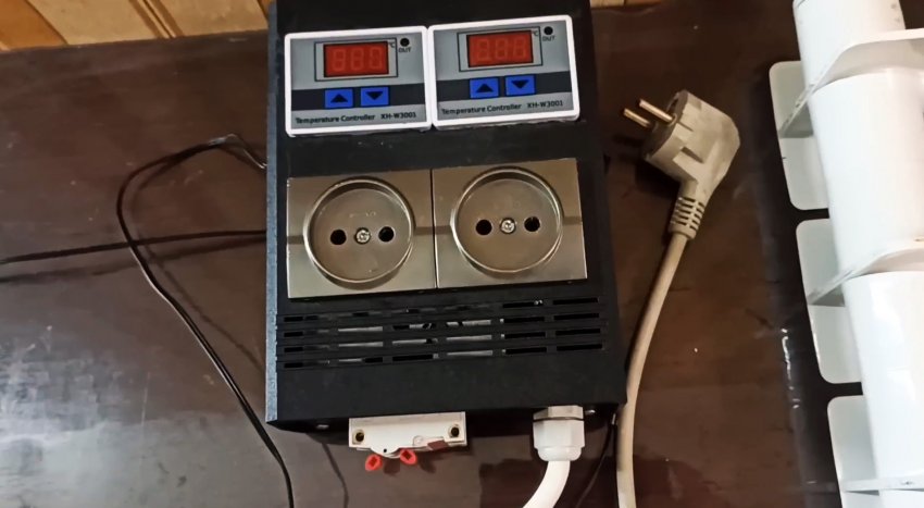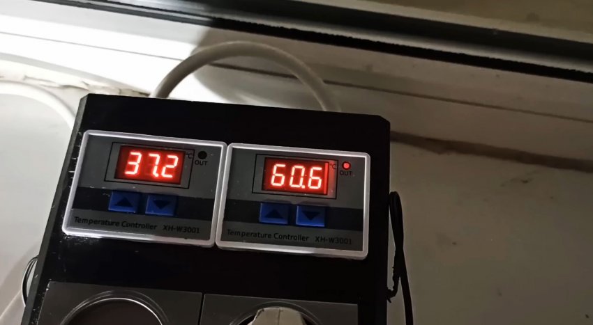 Нагреватель подключен, наблюдаем за эффективностью нагрева. Начальная температура была +27 градусов Цельсия. Уже через пять минут работы нагревателя, температура нижнего датчика достигла +44 градусов Цельсия. Воздух над батареей прогрелся до +35,9 градусов Цельсия. Через 30 минут нижний термометр показывает +60 градусов Цельсия. Датчик над батареей +40 градусов Цельсия. Неплохо!