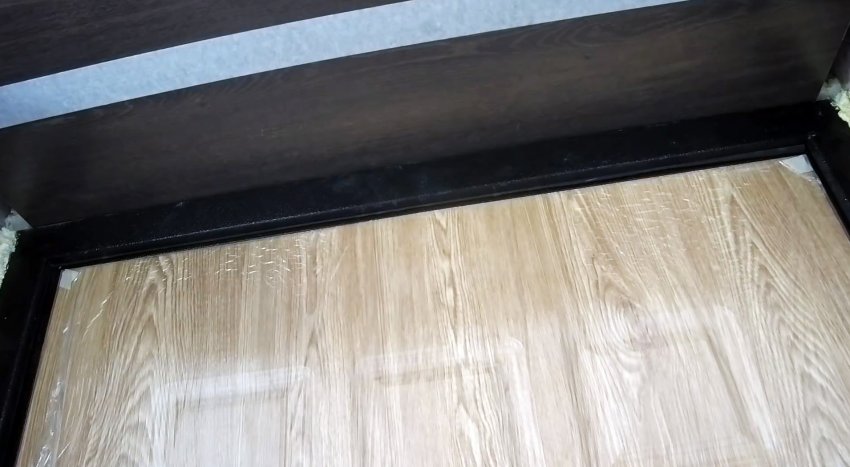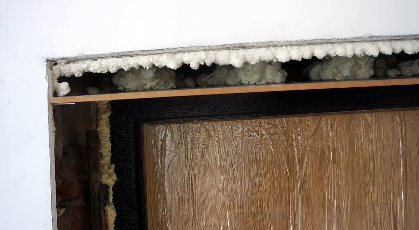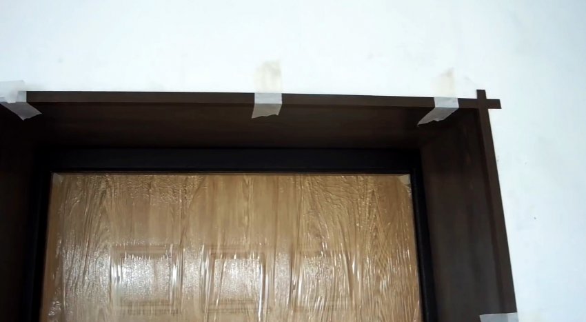 Перед тем, как установить верхнюю планку на место выполняем валики из строительной пены, чтобы они лучше поджали ламинат к дверной коробке. Для удобства и освобождения руки по краям забиваем на время финишные гвозди для поддержки панели.