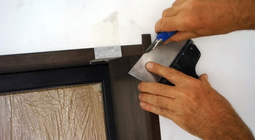 Накладываем декоративные уголки и фиксируем малярным скотчем. Подрезаем уголки канцелярским ножом по шпателю и по надрезу отламываем лишнее. То же самое повторяем и с другим уголком. В результате получается идеальное соединение, а в итоге – отличные откосы.