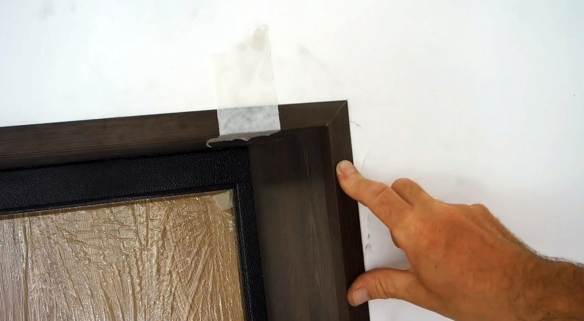 Наклеиваем обрезки ламината к дверной коробке для временной фиксации боковых панелей. Отмечаем по краю откоса линию отреза на панели. Отпиливаем лишнее, предварительно разобрав все планки ламината.