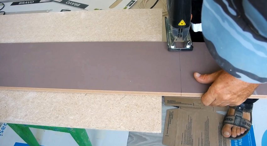 Монтаж откосов начинаем с разметки панели ламината под верхнюю планку. Отпиливаем 2 одинаковые по длине заготовки, т. к. ширина ламината составляет 19,5 см, тогда как ширина откоса 28 см.