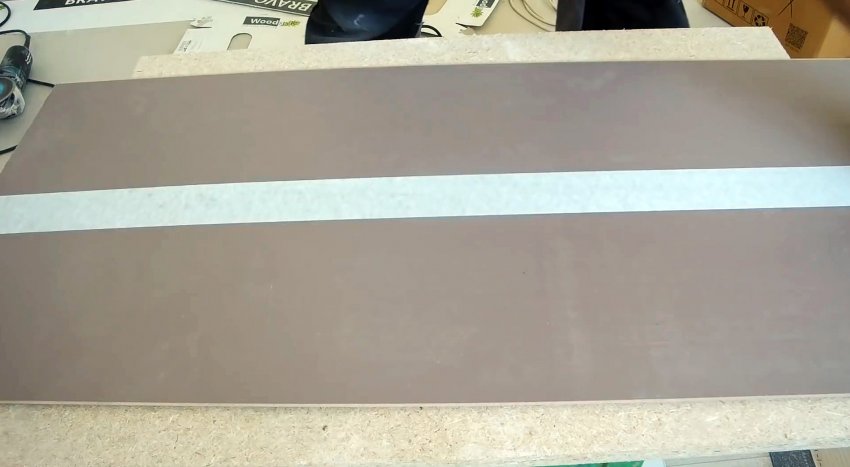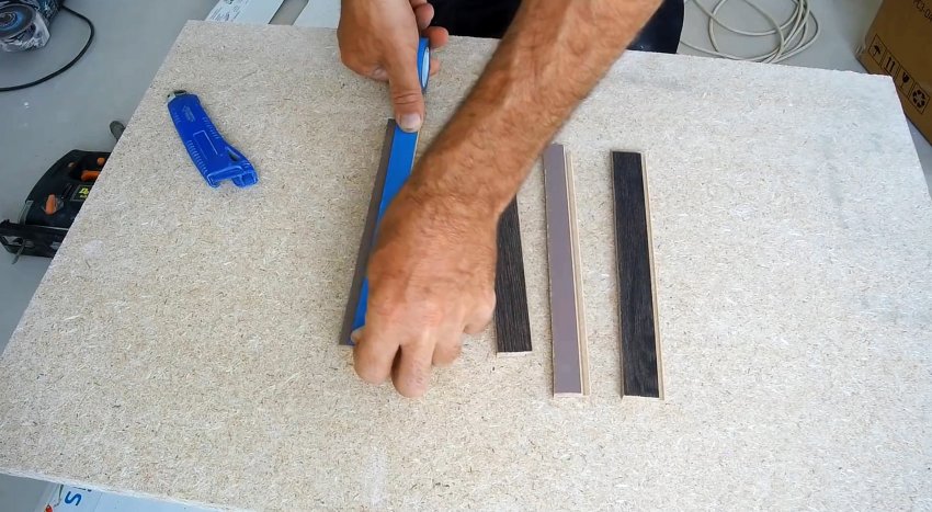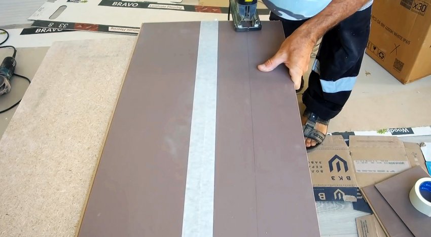 Защелкиваем замки отпиленных планок ламината и обклеиваем линии контакта с одной и другой стороны посредством малярного скотча для предотвращения раскрытия замка. Затем устанавливаем заготовку верхней планки к откосу по месту для примерки, отмечаем линию отреза на поверхности ламината и отпиливаем лишнее.