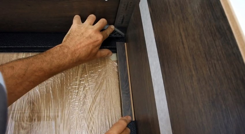 Для временной фиксации откосных боковин к коробке двери воспользуемся обрезками ламината с наклеенными полосками двухстороннего скотча. Замеряем с помощью угольника угол разворота боковых панелей, который оказался на 3 мм больше от прямого угла на конце откоса.
