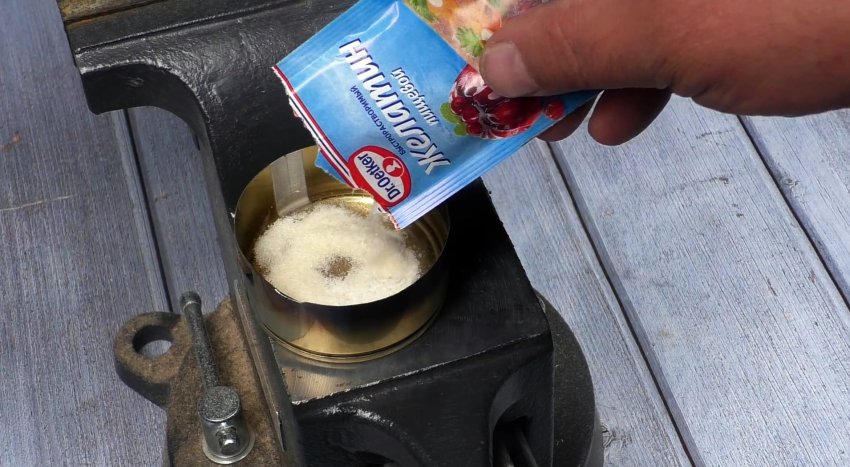 После растворения желатина в кипящей воде, добавляем одну столовую ложку уксусной кислоты крепостью 70% и содержимое баночки хорошо перемешиваем.