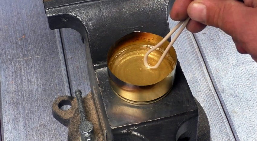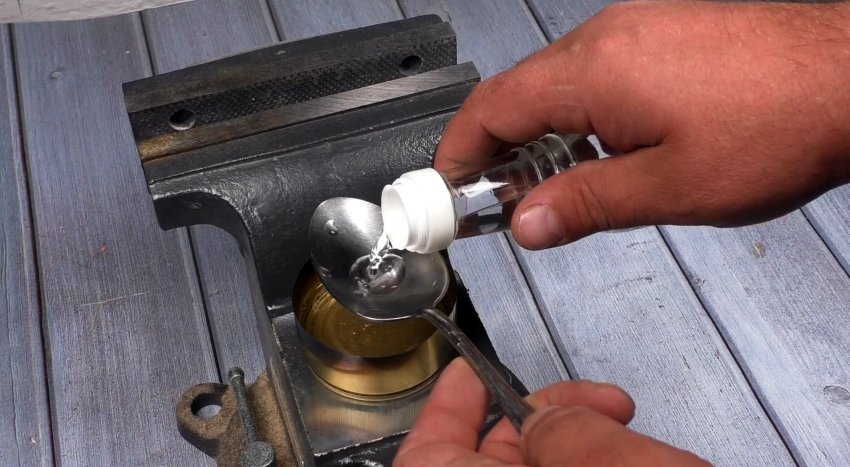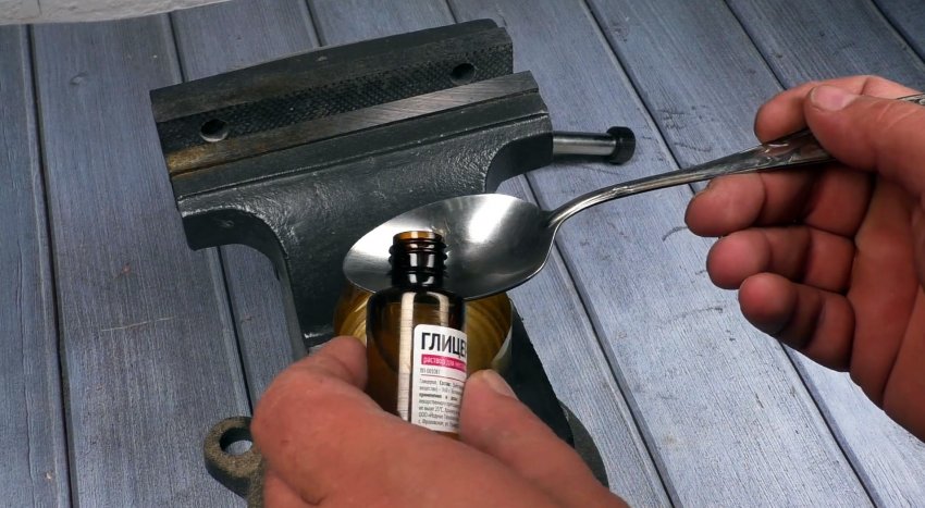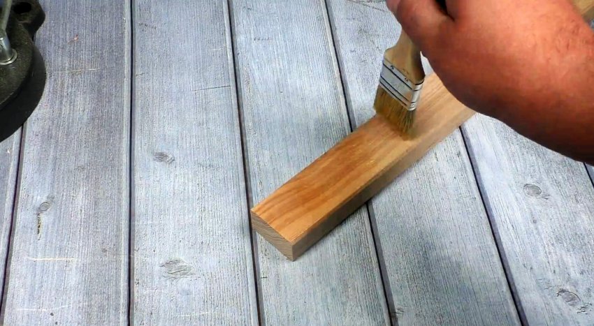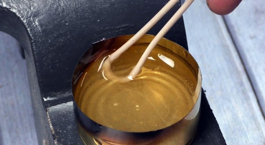 Содержимое баночки снова тщательно перемешиваем, и мы получаем очень мощный клей. Чтобы убедиться в этом, наносим клей кисточкой на деревянную заготовку и оставим на короткое время. Затем посмотрим, как он схватится.