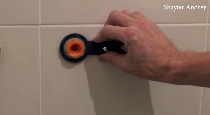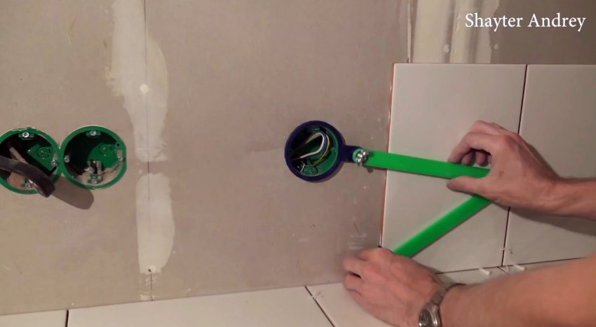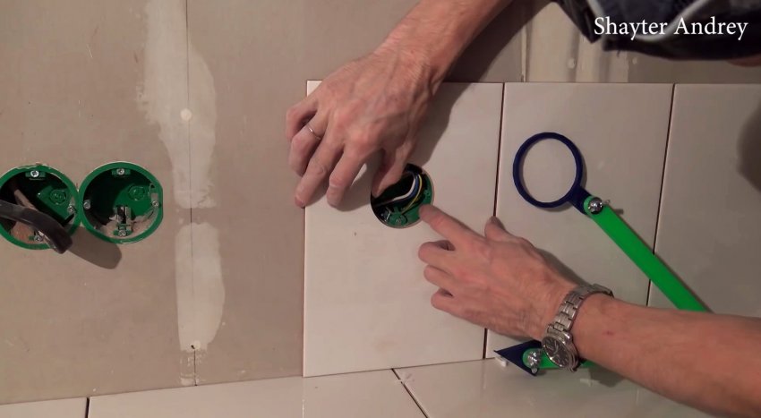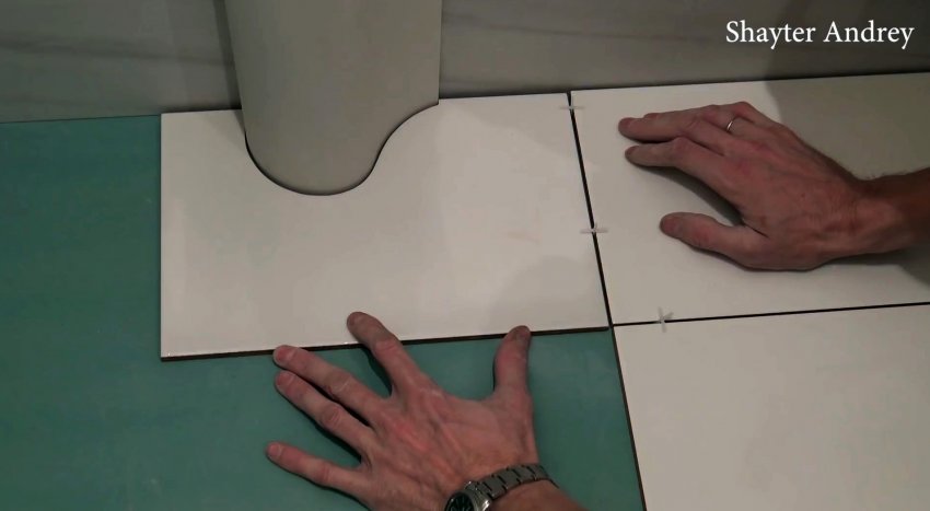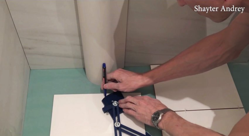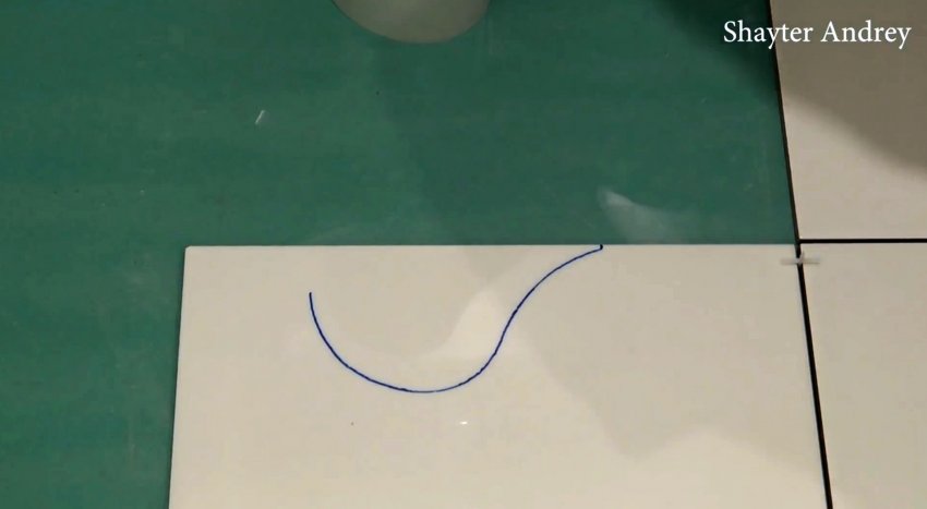 Перед тем, как вырезать отверстие в плитке нужно наложить на неё шаблон нужного диаметра и обвести контур маркером.