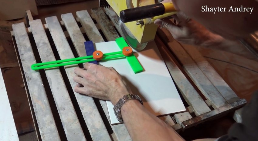 Перед тем, как сделать плоский рез, упор укладывается на плитку, подводится к стене и фиксируется стопорным винтом, а затем переносится на плитку. При этом зазор между стеной и лекалом обычно принимается «на глазок», ориентируясь на ранее положенную плитку. Полученную линию не обязательно отмечать маркером на поверхности плитки – фреза плиткореза может двигаться рядом с лекалом.
