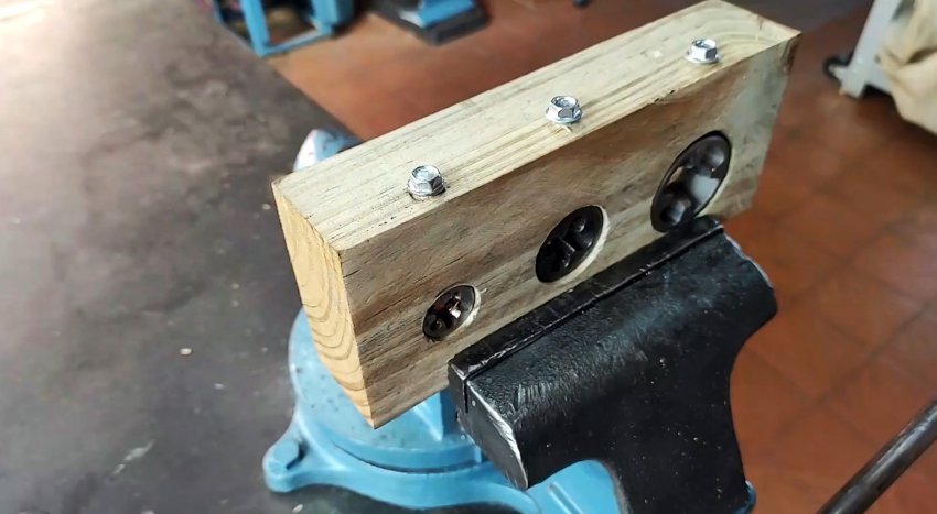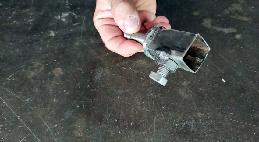 Для крупного бруска изготовим специальную оснастку. Для этого к торцу квадратного патрубка привариваем шайбу и пруток. В стенке трубы сверлим отверстие 6 мм, соосно привариваем гайку. У головки болта М6 срезаем боковые грани для удобства ручной фиксации: зажим для бруска готов!