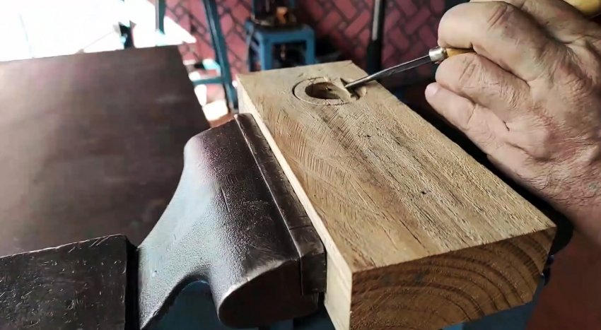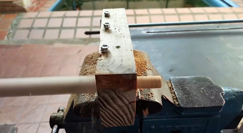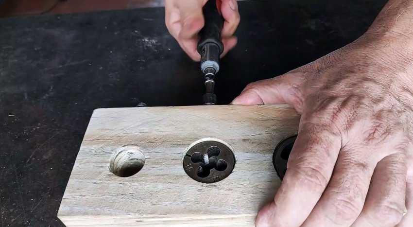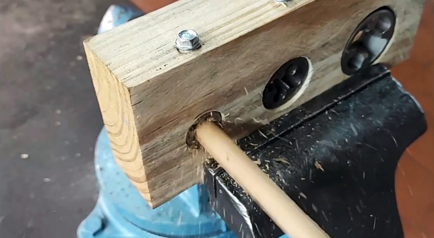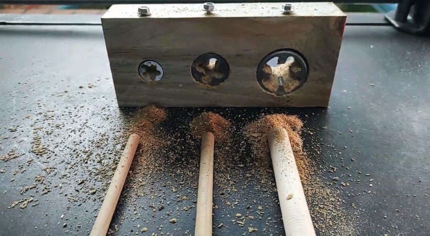 - Дерево легко войдет в отверстие плашки, если предварительно слегка заострить торец бруска.