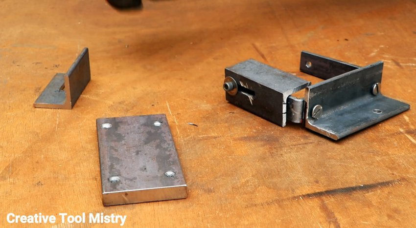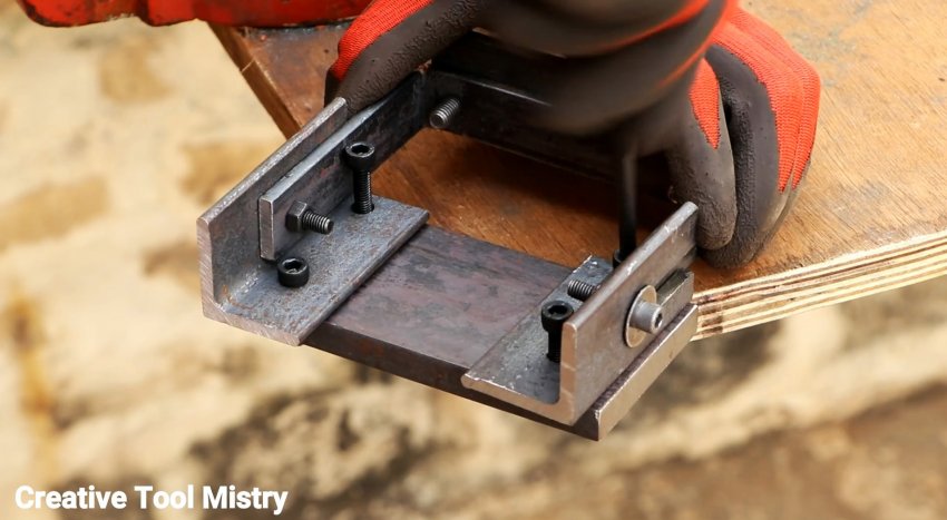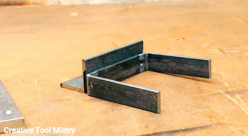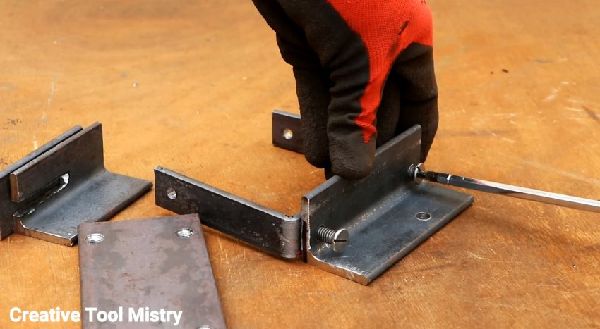 К скобе прикручивается винтами первый уголок длиной 200 мм. Далее нужно зажать по бокам уголки с пропилами, используя болты и гайки М6.