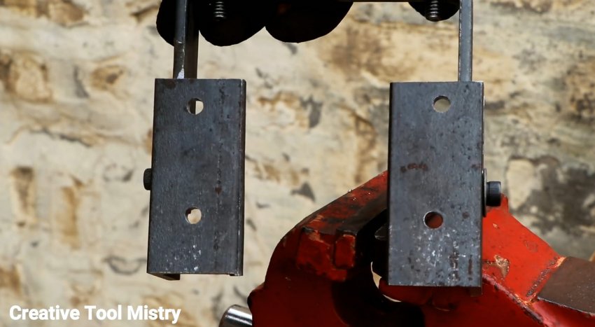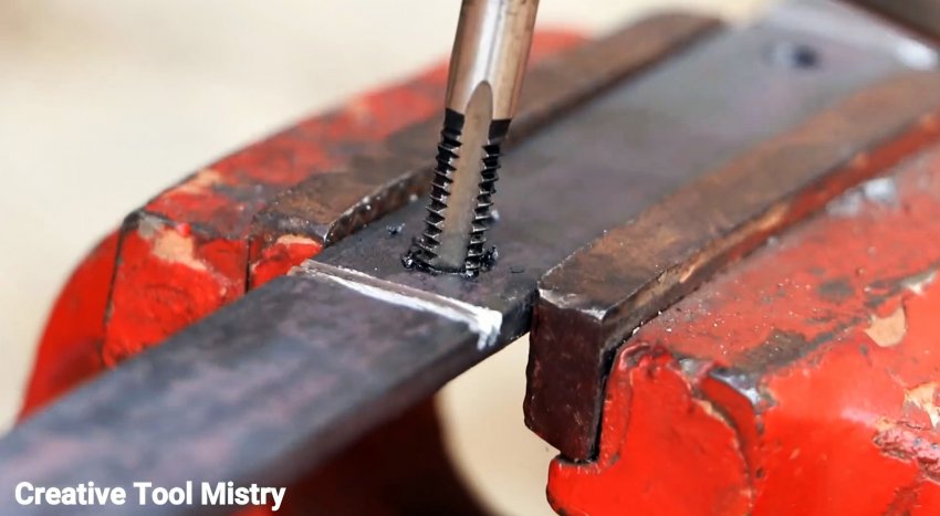 Снова примеряем к полосе уголок, и переносим на него расположение отверстий. Затем он также просверливается. В отверстиях полосы нарезается резьба М6. Далее по насечкам выгибаем из полосы скобу.