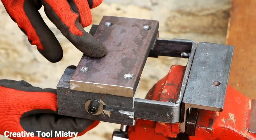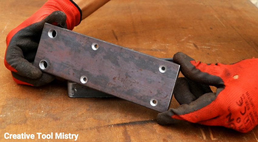 Из листовой стали сечением 6-10 мм нужно выпилить пластину 200х70 мм. По углам в ней делаются отверстия, и в них нарезается резьба М6.