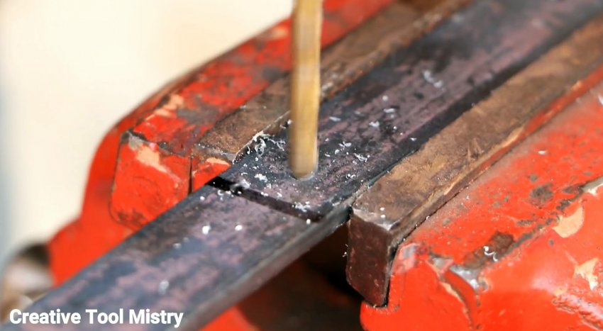 Далее берется полоса длиной 500 мм. К ней в центре прикладывается ранее подготовленный уголок. На полосе отмечаются края уголка. Перед метками она просверливается сверлом 6 мм. Затем по линиям ее необходимо надпилить для изгиба, оставив по 2 неглубокие насечки.