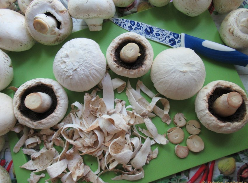 Мыть шампиньоны мы не будем, поскольку лишняя влага лишь увеличит время их засушивания. У нас есть два варианта подготовки грибов к сушке. В первом случаем мы можем просто счистить остатки грязи и мусора с шампиньонов с помощью мягкой щетки. Но вряд ли этот способ может нам гарантировать идеальное избавление от всех микробов. Во втором случае мы можем снять с грибной шляпки тонкий слой кожицы вместе со всеми загрязнениями. Именно этот вариант нам нравится больше. Поддевать края кожицы удобно с нижней стороны шляпки при помощи кончика ножа или кофейной ложечки. Кроме того, потемневшие кончики грибных ножек мы тоже немого срежем (приблизительно на 3 мм.). Поврежденные участки и вмятины также удалим. После всех подготовительных манипуляций у нас собралась довольно-таки приличная кучка отходов из срезанных кончиков ножек и кожицы, вес которой составил порядка 180-200 г. Это вполне естественные потери при обработке шампиньонов. Стало быть, у нас остается около 800 г. грибочков.