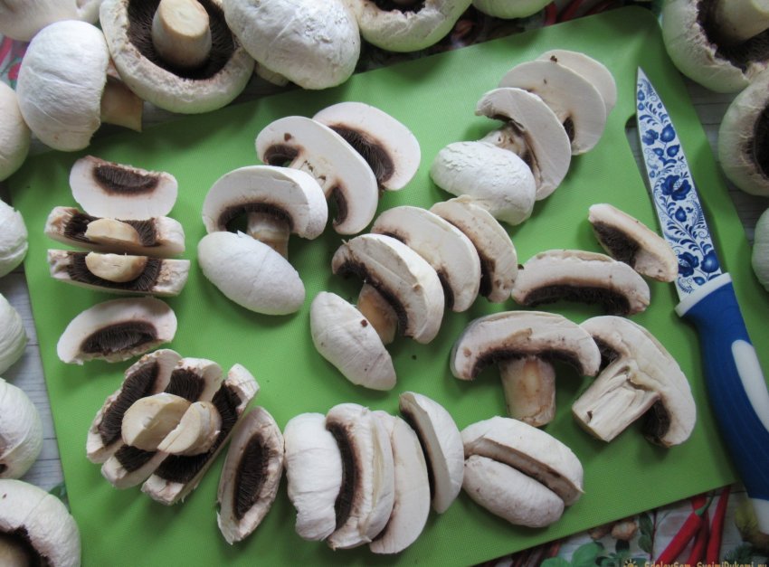 Разрежем каждый шампиньон на несколько пластинок (их получится примерно четыре). Стараемся, чтобы толщина нарезки была одинаковая, скажем, 7-8 мм.