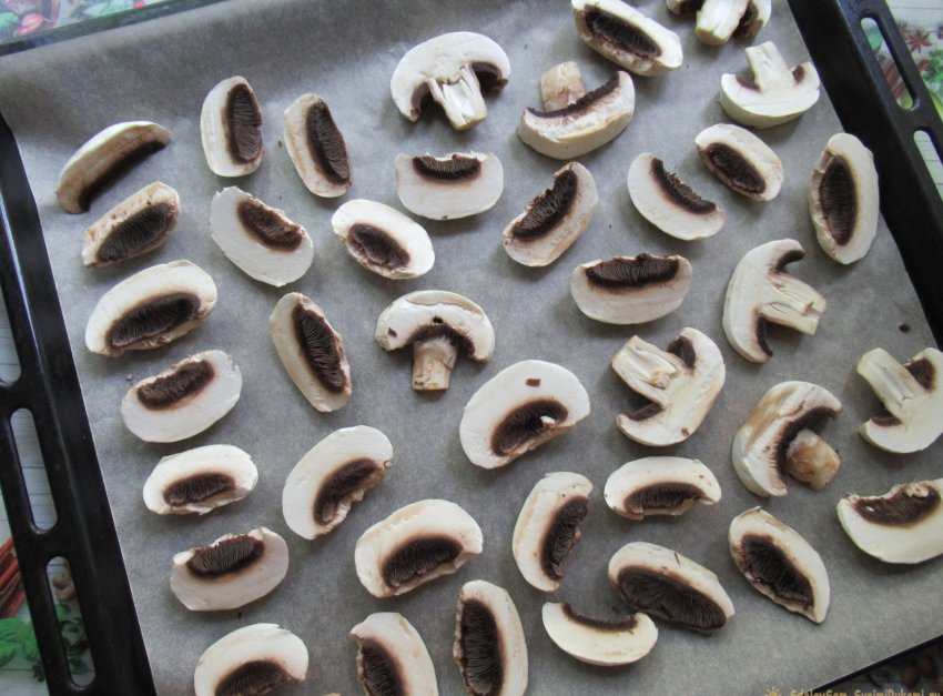 Вариант второй. Противень, поднос или деревянную доску застелем пергаментом и в один слой разложим на нем пластинки шампиньонов, опять-таки оставляя между ними немного свободного пространства. То есть не допускаем их соприкосновения. Кстати, вместо противня очень удобно использовать оконную москитную сетку или решетку из духовки. По возможности ежедневно (а то и дважды в сутки) желательно переворачивать грибы на другую сторону для их равномерного просушивания.