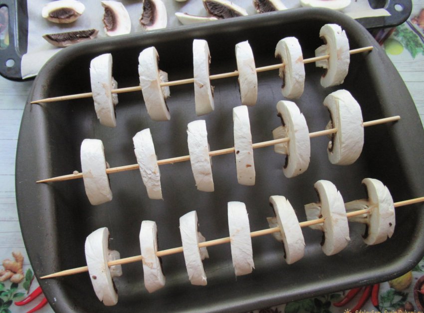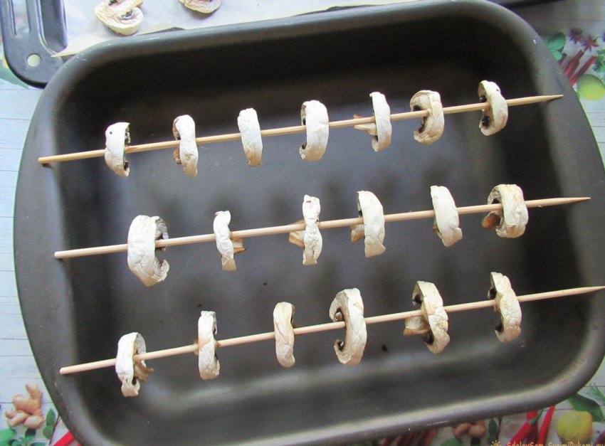 Третий вариант. Нанижем пластинки шампиньонов на тонкие деревянные шпажки и установим их на глубоком противне.
