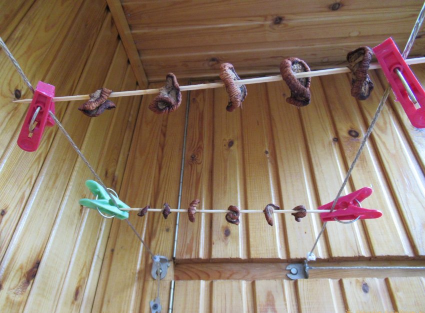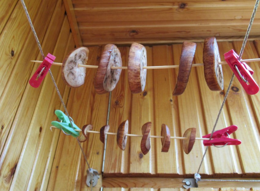 Выбираем место для сушки. Мы поместили шпажки с колечками овоща на балконе, прицепив их за кончики при помощи бельевых прищепок к натянутому тросу.