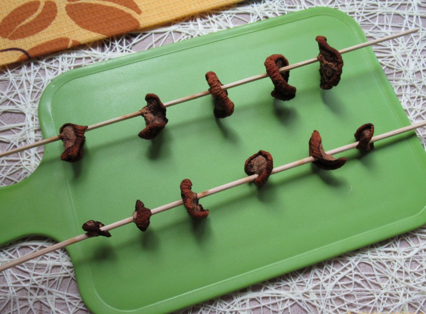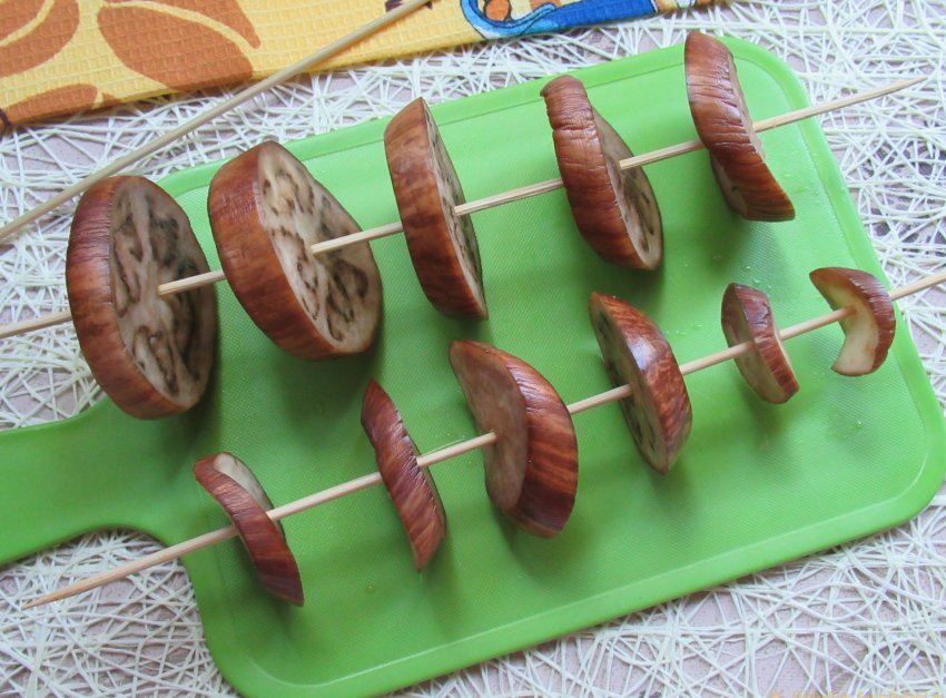 Приступаем к заключительному этапу активных действий – нанизываем кольца баклажана на деревянные шпажки (кстати, можно вместо шпажек использовать толстую суровую нить). Аккуратно протыкаем концом шпажки центр каждого колечка и равномерно распределяем на расстоянии 2-3 см. друг от друга.