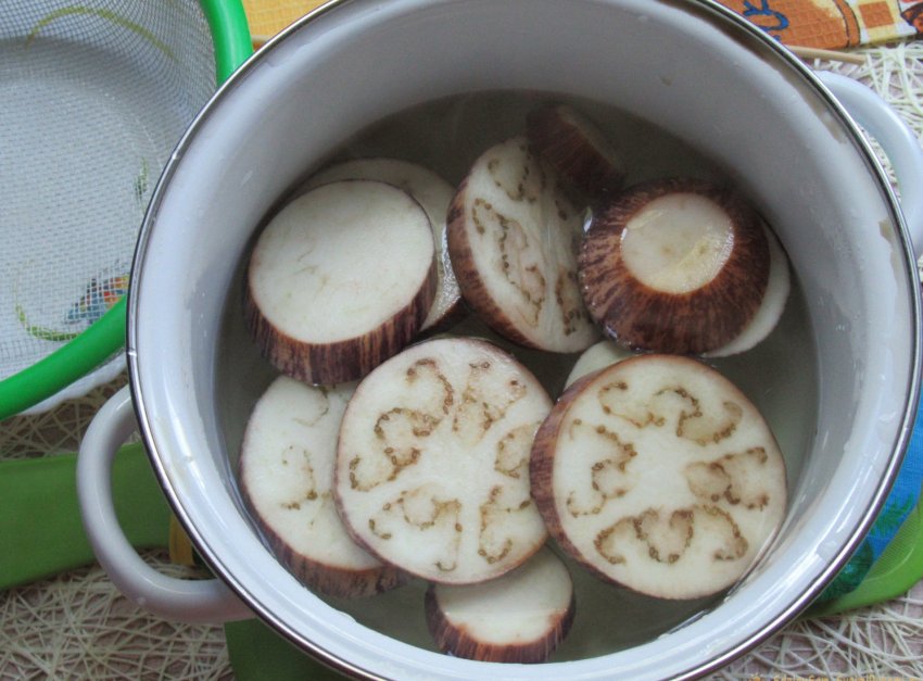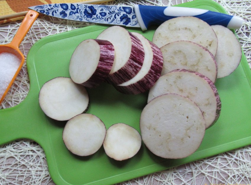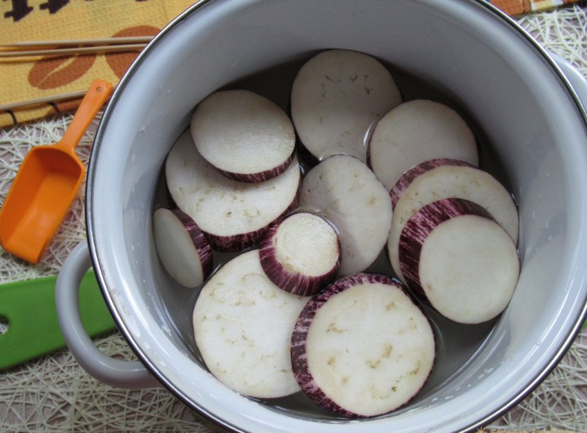 Теперь, чтобы выгнать из овоща еще больше горечи, кольца баклажана бросаем в прохладную воду, в которой мы предварительно размешали подготовленную соль, и оставляем на 25-30 минут.