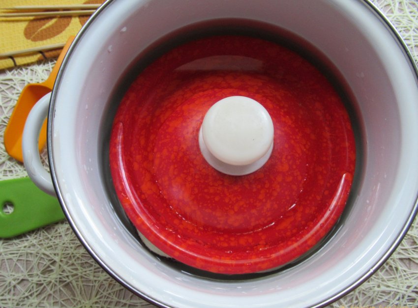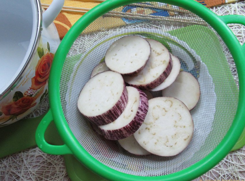 Сразу бросаем кольца баклажана в кипяток и прижимаем крышкой (тарелкой), чтобы части овоща не высовывались наружу. В таком виде выдерживаем 2-3 минуты (при выключенном огне). Так из баклажана выйдет небольшая часть горечи.