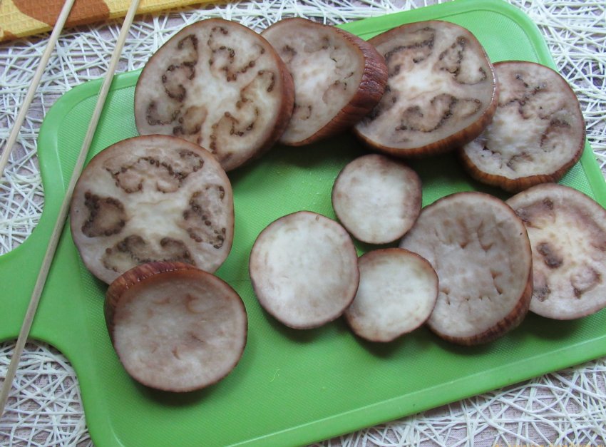 Как вариант, кружочки баклажанов можно высушить, разложив на пергаменте или москитной сетке. Но в этом случае необходимо ежедневно переворачивать каждый кружок на другую сторону, чтобы овощ равномерно просушивался.