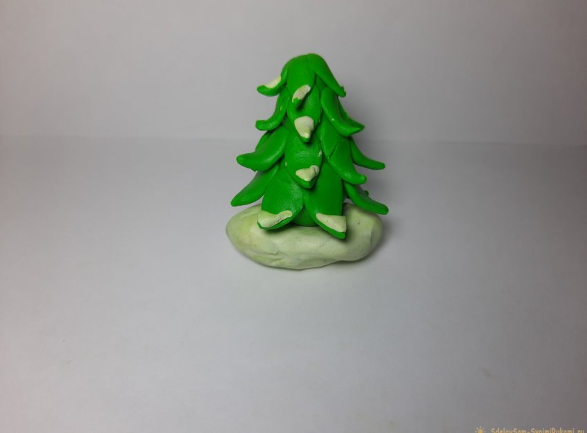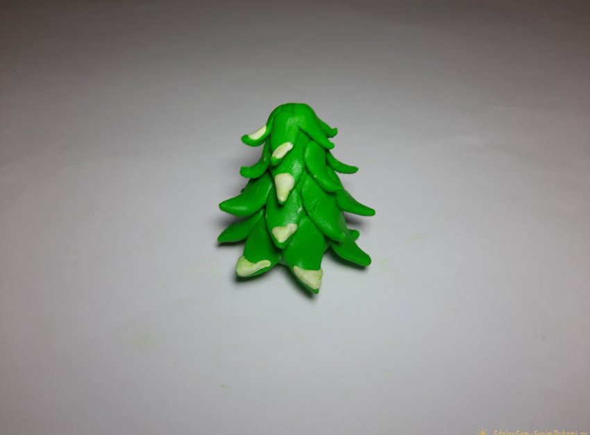 5. Далее нужно взять пластилин белого цвета, а затем покрыть им кончики веток елочки. Это будет представлять собой снег на ветках.